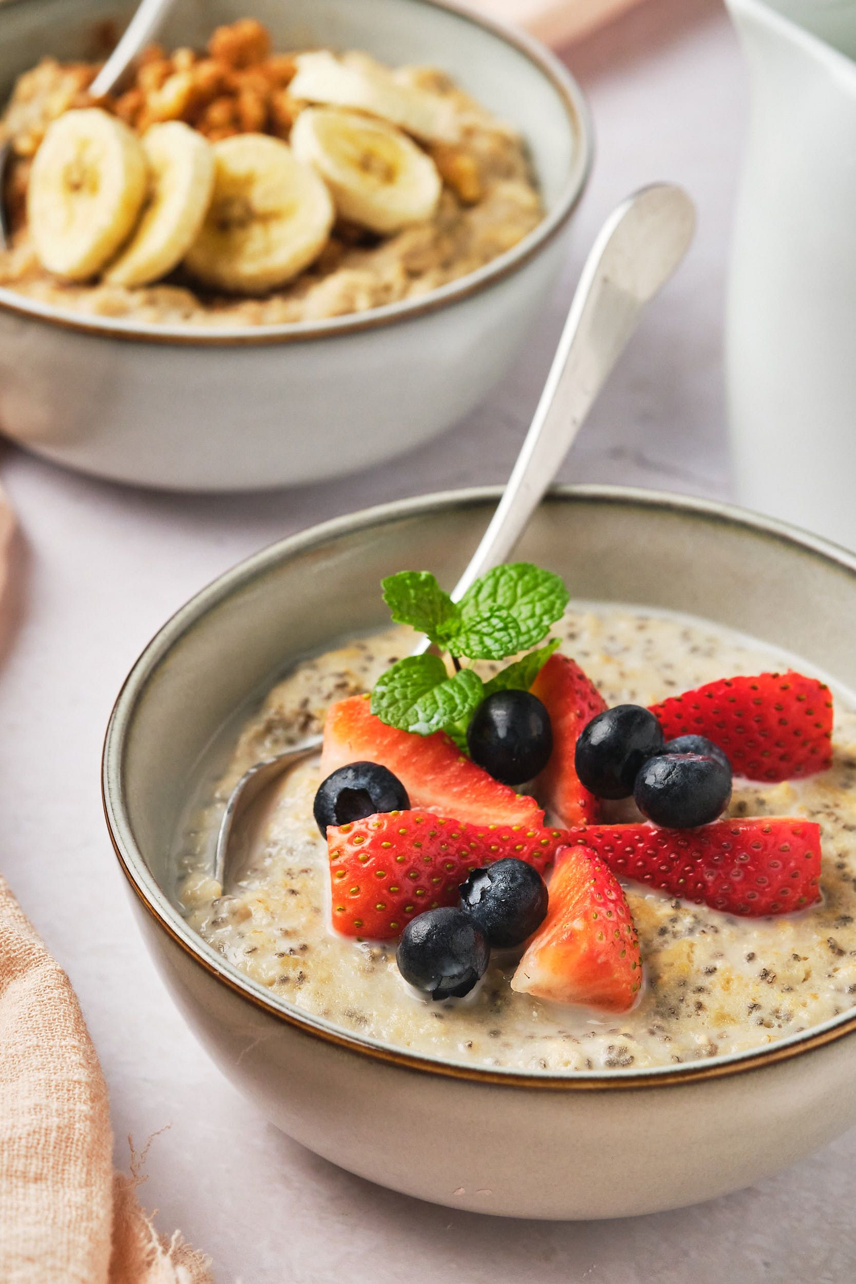 Note: If you want to add chia seeds to your oatmeal, be sure to increase the non-dairy milk to 1 3/4 cups, because the seeds will absorb quite a bit of liquid.