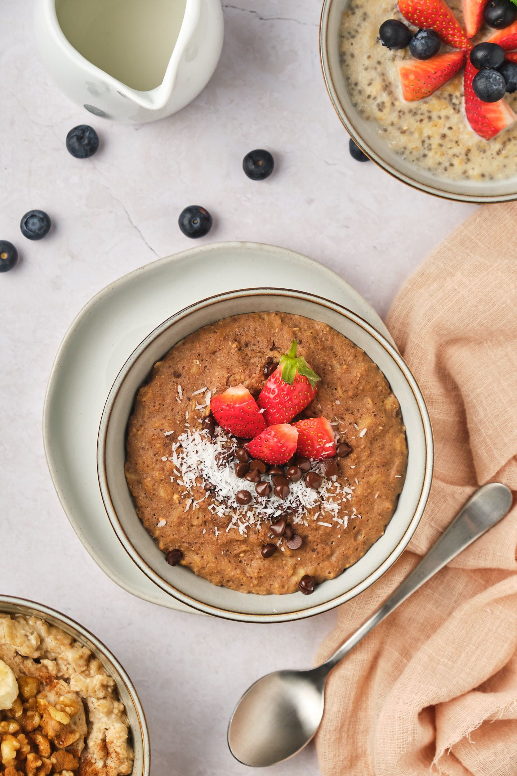 Chocolate strawberry coconut: Mix cocoa powder and coconut shreds into the oatmeal, then top with more coconut shreds, sliced strawberries, and chocolate chips.