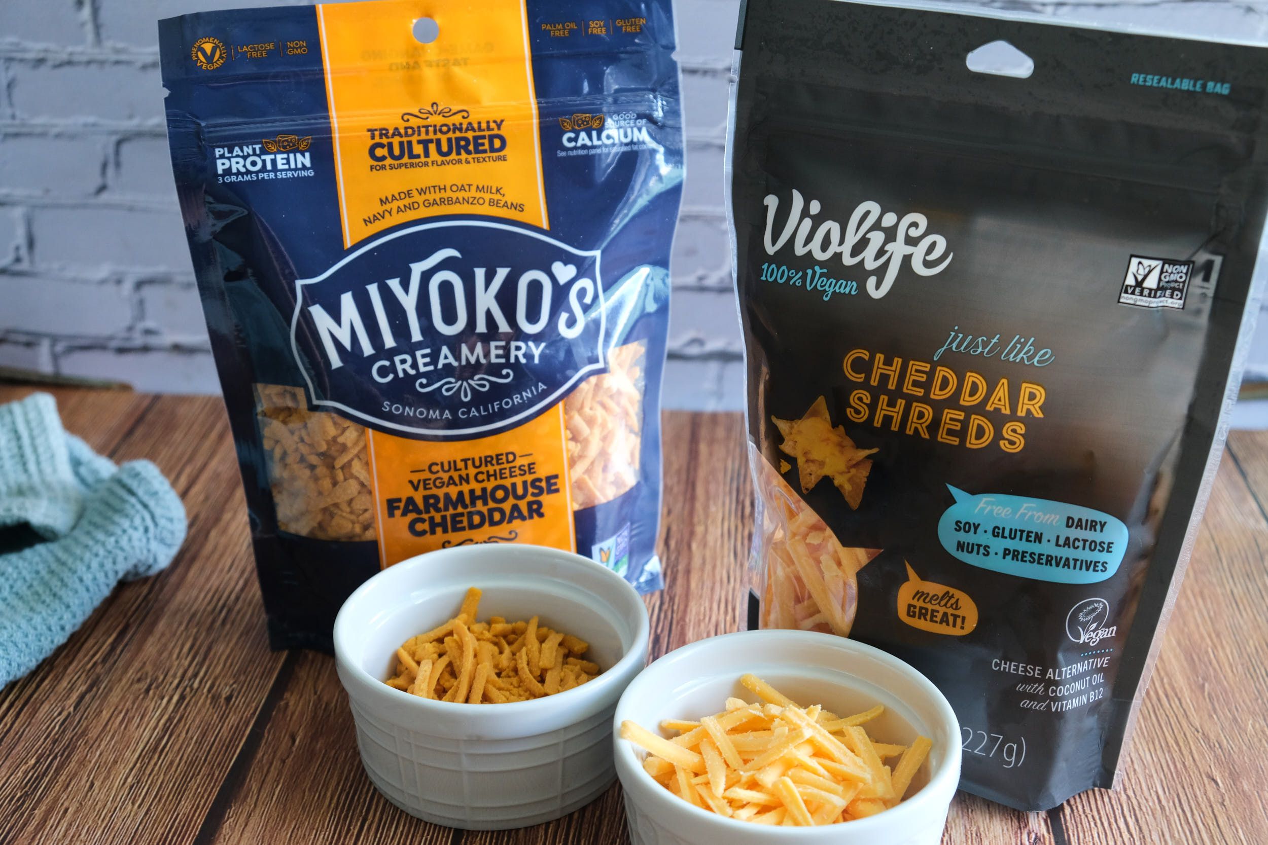 I found that a blend of Violife and Miyoko's vegan cheddar shreds tasted best in this recipe; however if I were to recommend just one, it would definitely be Miyoko's.