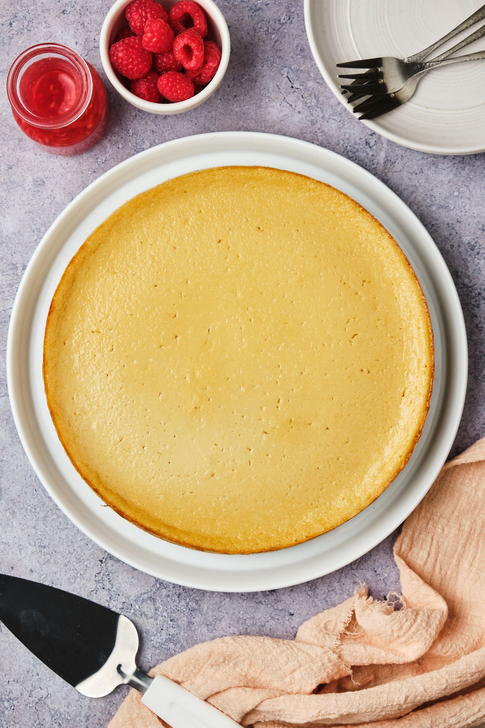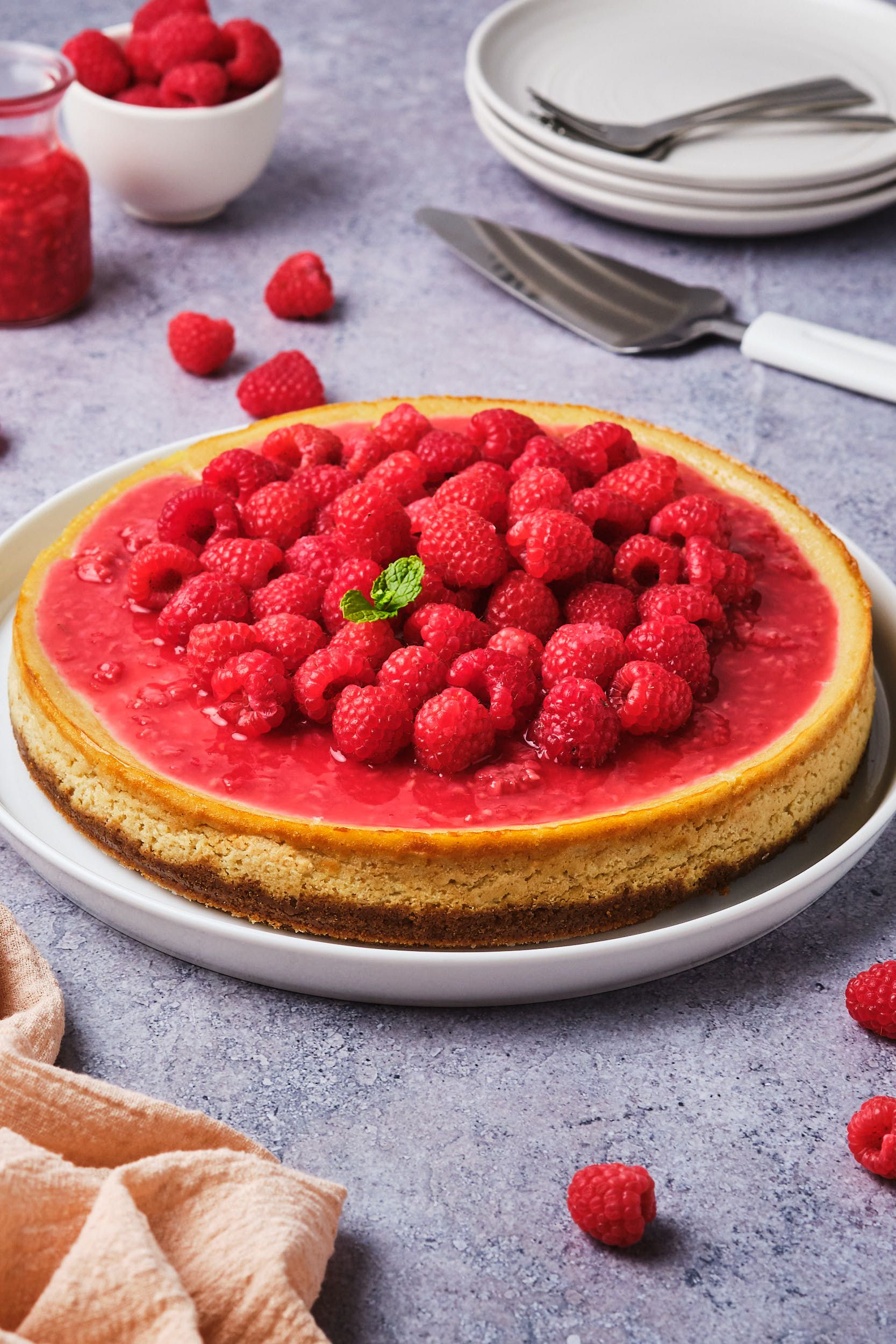 To serve, remove the sides of the pan, then run a thin spatula or butter knife under the crust to release it all the way around. You can move it to another platter using a cake lifter or a pair of large spatulas. Serve topped with berry compote and additional fresh berries.
