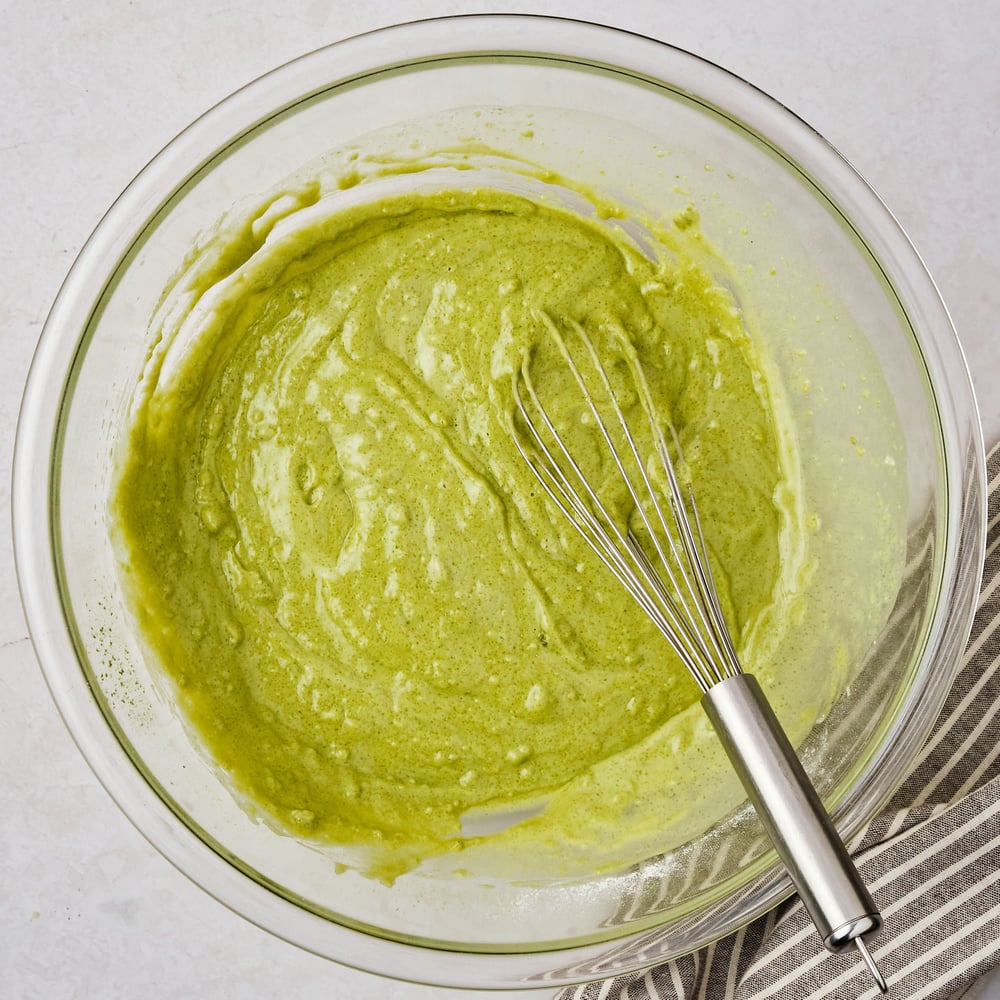 Sift flour, sugar, matcha, baking powder, and salt together into a medium mixing bowl, then whisk to combine.