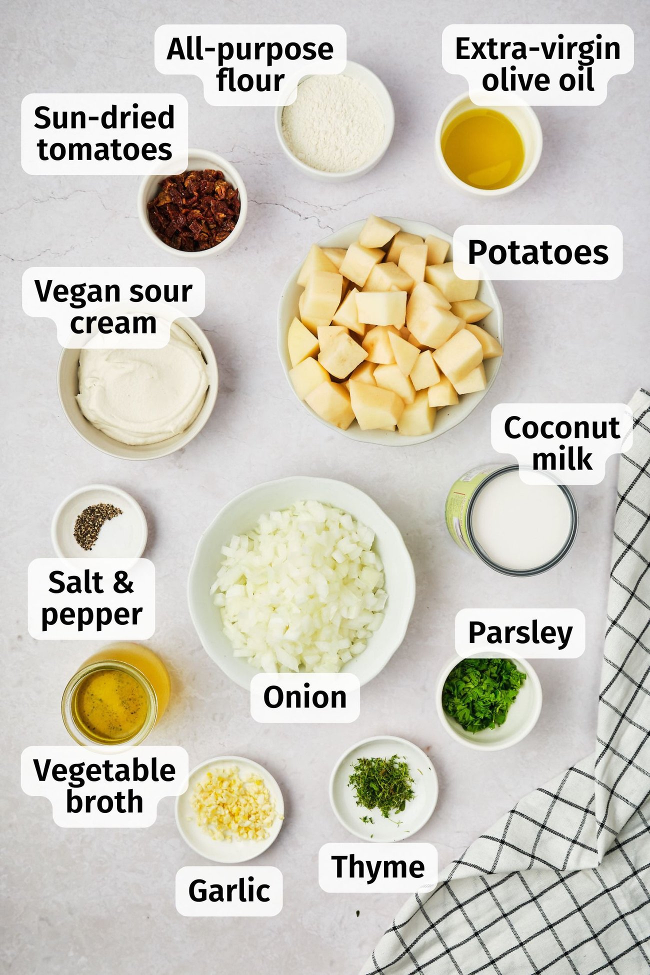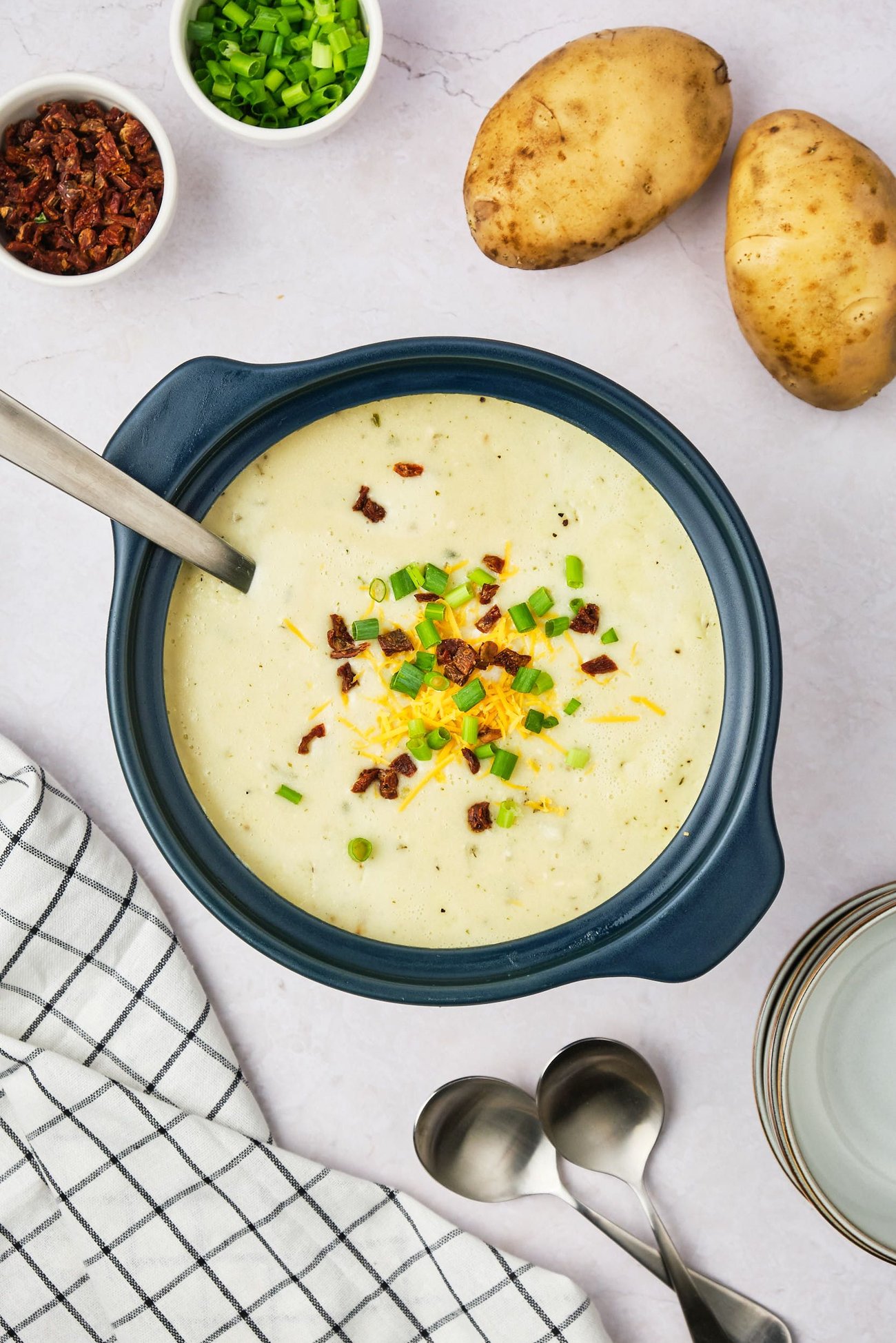 Serve your potato soup plain or topped with vegan sour cream, sun-dried tomatoes, vegan cheddar cheese, and green onions.