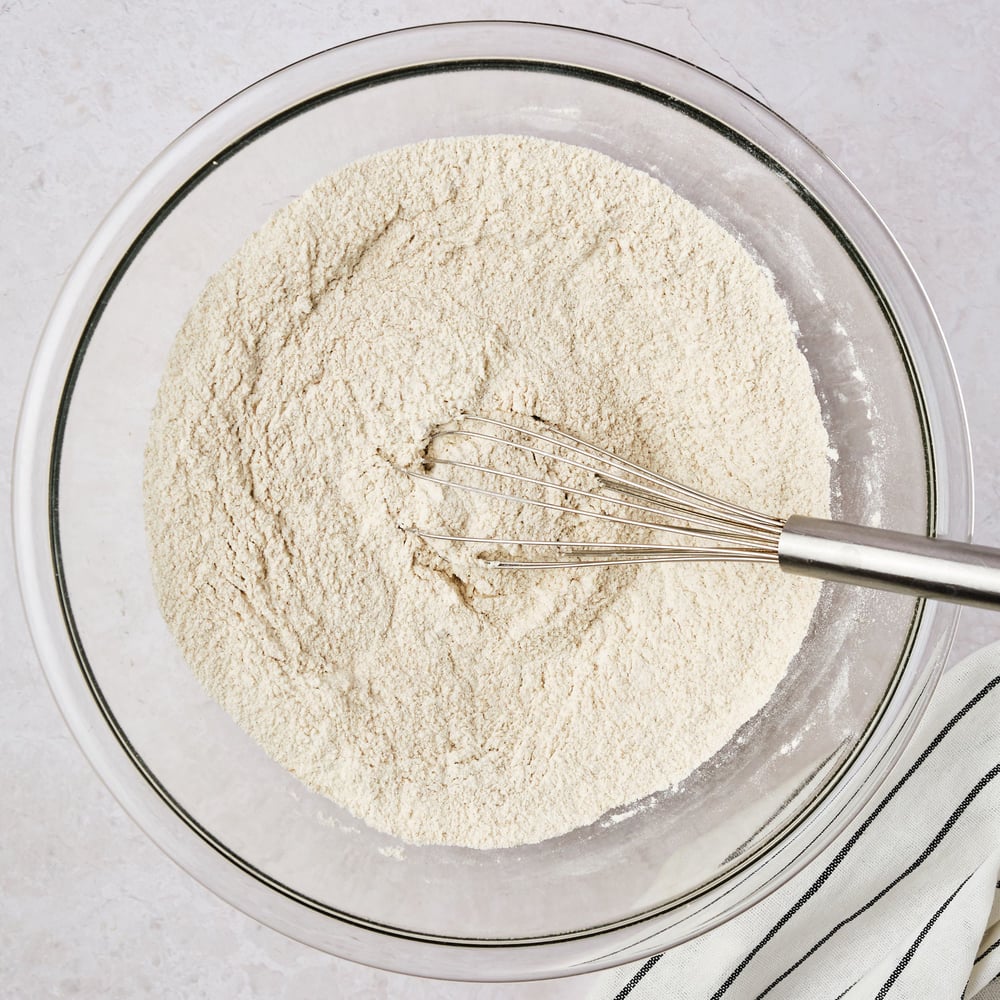 In a medium mixing bowl, sift together flour, brown sugar, baking powder, pumpkin pie spice, and salt, then mix well.