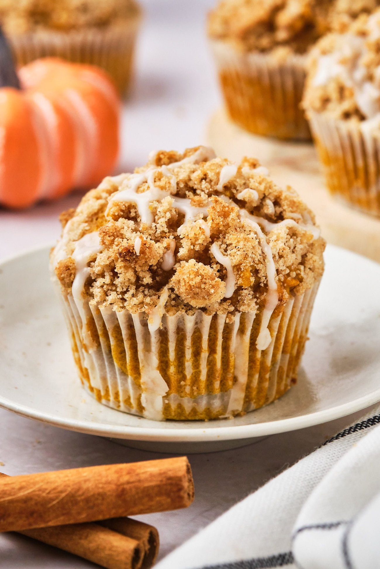 These vegan pumpkin muffins are the perfect fall treat, made with real pumpkin puree and a warm blend of spices. They have a crunchy, sweet cinnamon streusel crumb topping and tangy icing that perfectly balances the rich flavors. And they're so easy to make that you can keep them in rotation throughout the fall season for quick vegan breakfasts, afternoon snacks, and sweet desserts.