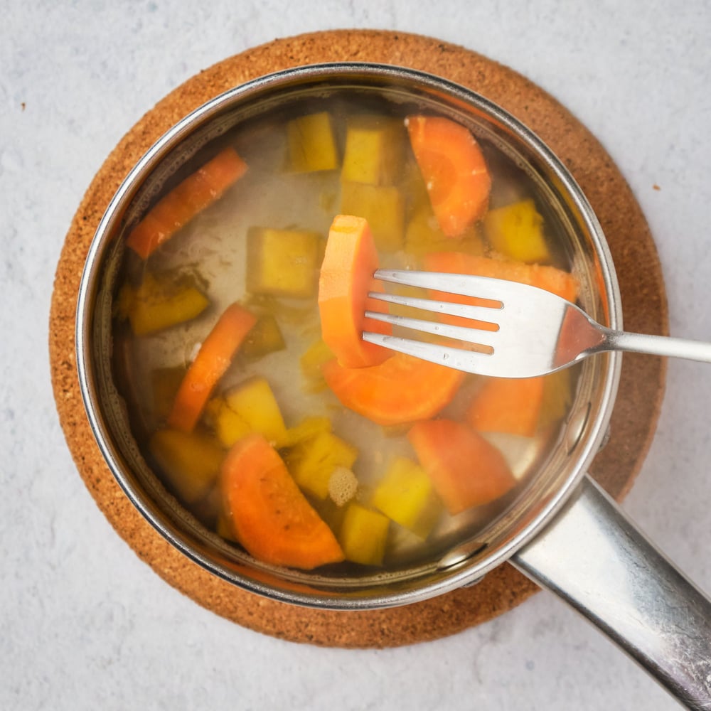 Start by boiling your butternut squash and carrots until fork-tender (about 5 minutes). Turn off the heat and drain the water.
