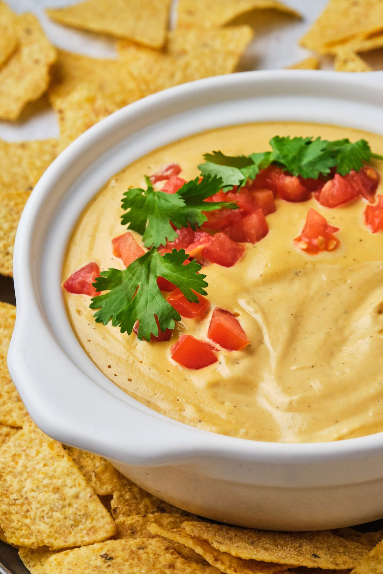 Store any leftovers in an airtight container in the refrigerator for 3 to 4 days. To reheat, put your vegan queso in a saucepan and heat on low on the stove, stirring constantly. Add a splash of water if your dip gets too thick.