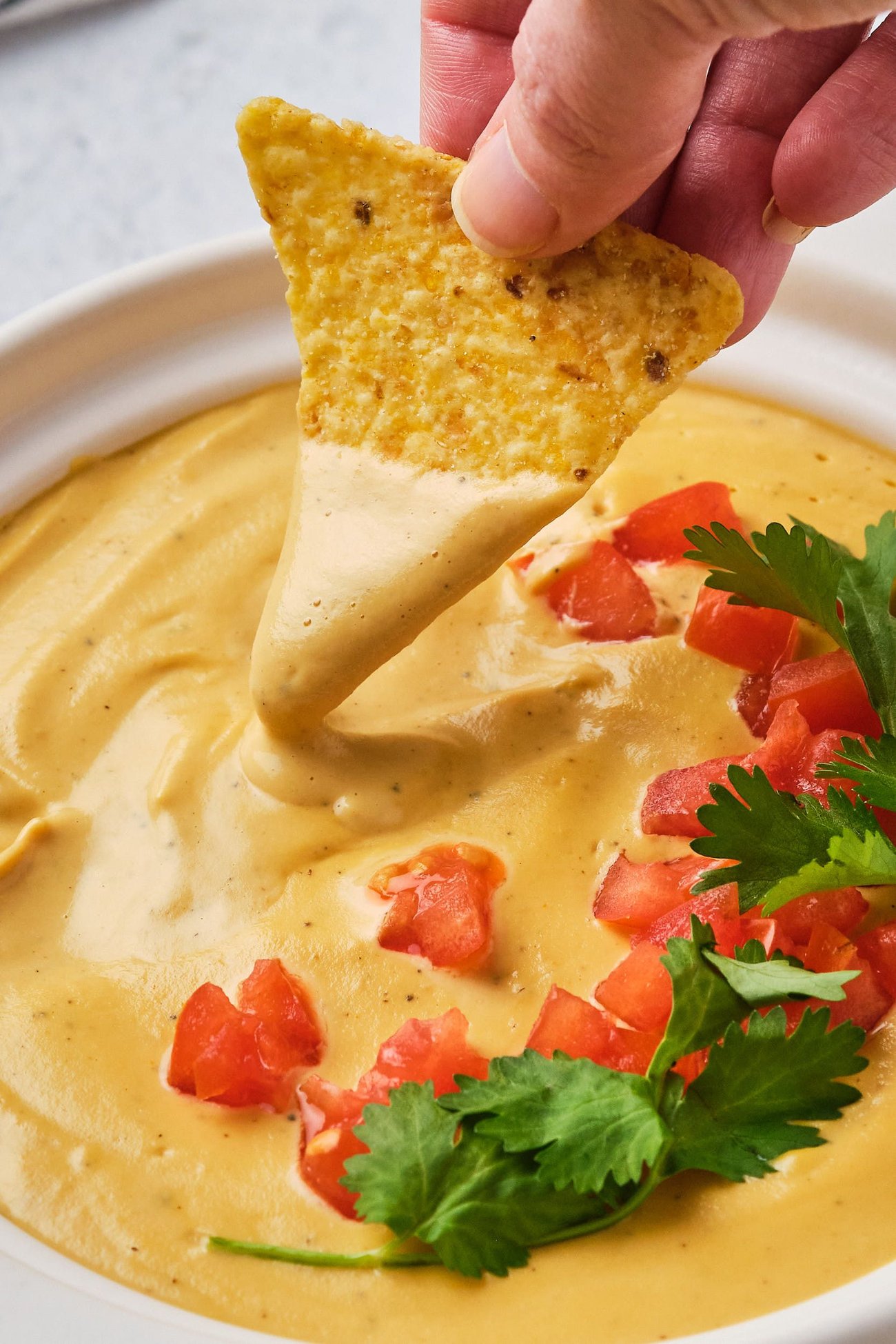 For spicy dip: This dip isn't spicy, but you can make it spicy if you want to. Adding some minced fresh peppers, hot sauce, chili powder, or cayenne pepper can turn up the heat on your vegan queso. (If you're using a powdered spice, start with a dash and add more if needed.)